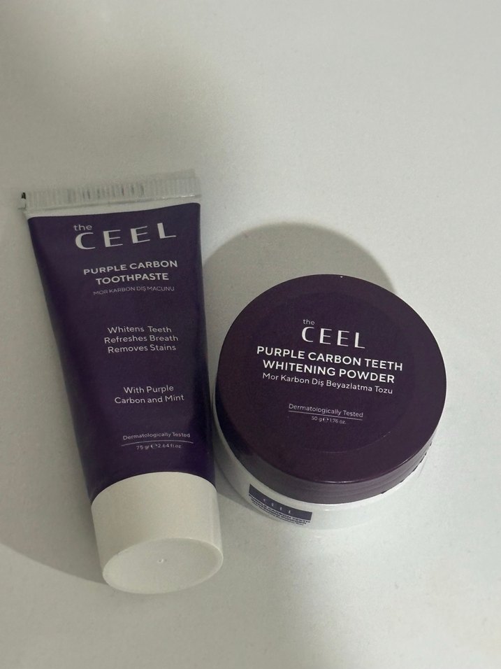 The CEEL Mor Karbon Diş Beyazlatma seti, dişleri beyazlatır, nefesi tazeler ve mor karbon ile lekeleri giderir. Diş macunu ve beyazlatma tozu içerir.