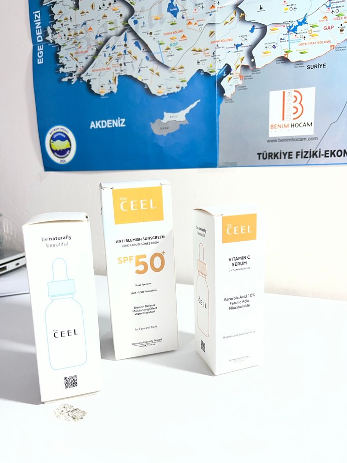 The ceel markasının SPF 50 güneş koruyucusu ve Askorbik Asit ile Niacinamide içeren C vitamini serumu cilt bakımı için uygundur. ☀️ retinol de içindedir