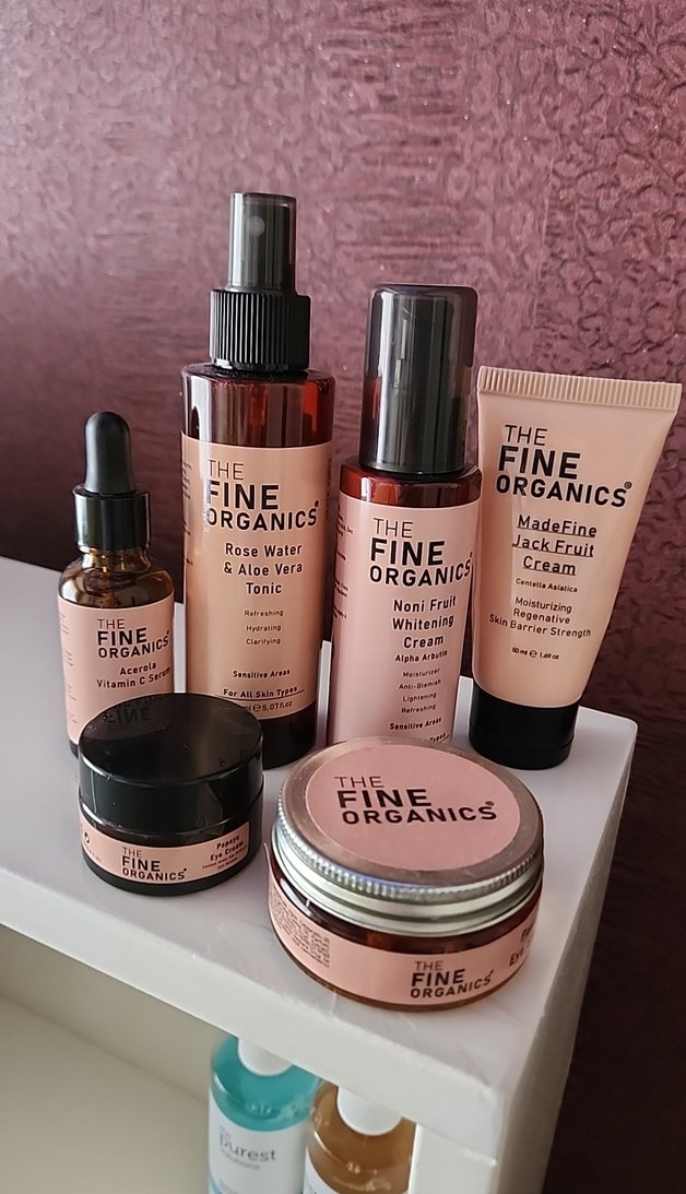 The Fine Organics cilt bakım seti, gül suyu & aloe vera tonik, noni meyvesi beyazlatıcı krem, MadeFine Jack Fruit krem ve C vitamini serumu içerir. Her biri neredeyse dolu şişe the Fine organics ürünlerine bakıp alabilirsiniz.Set olarak veriyorum. C serum, beyazlatıcı krem, kaş wax, göz kremi, gül suyu ve aleoveralı tonik, madefine jack fuit krem