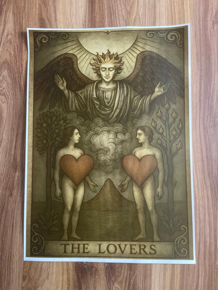 The Lovers tarot kartı posteri, iki figürün kalp sembolleri tuttuğu ve kanatlı bir meleğin yer aldığı mistik bir arka plana sahiptir. Astroloji ve fal tutkunları için uygundur.