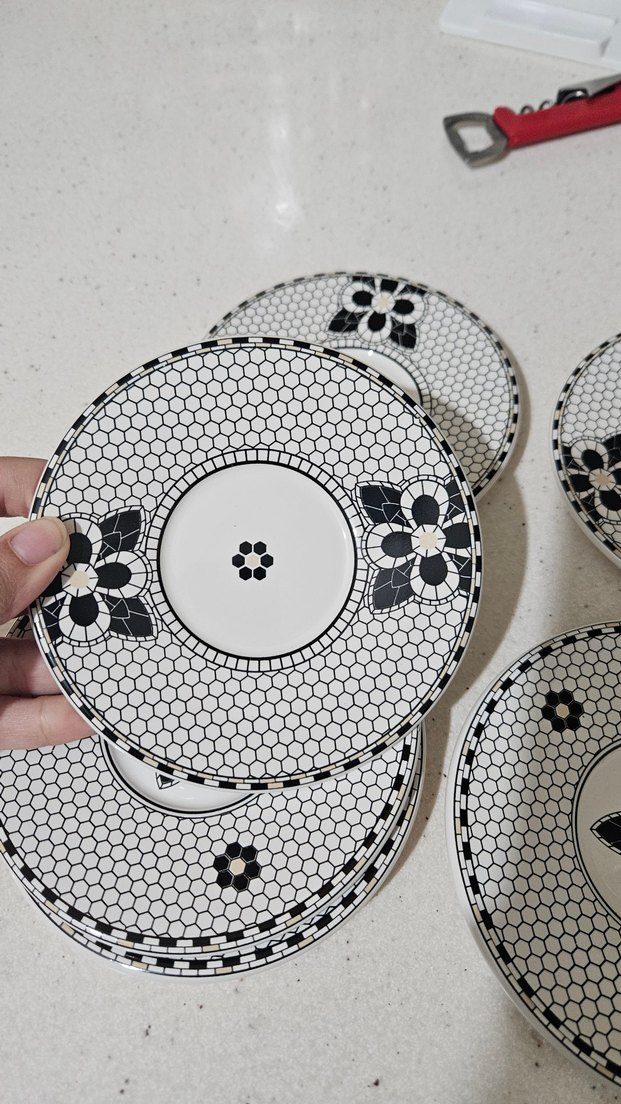 Siyah beyaz çiçek ve petek desenli tabak seti. Ortasında çiçek motifi ve koyu renk kenar detayları bulunur. ️Kırık, çatlak yoktur. 6 adet