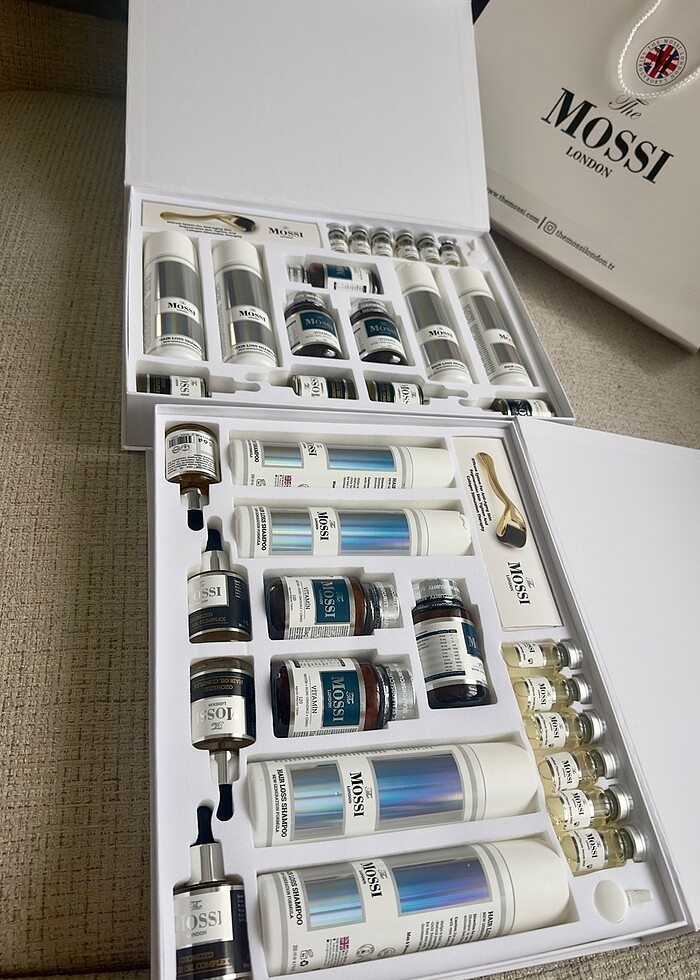 Mezoterapili The Mossi 6 Months Flacon Plus Hair Set Set içerigi: 4 Hair Loss Shampoo 200 ml 3 Hair Vitamin 120 Tablet 2 Ozonized Hair Oil Complex 50 ml 1 Ozonized Oil Serum Complex 50 ml 6 Hair Loss Therapy Serum (Dermoroller'li uygulama) Kadın ve Erkek Kullanımına uygundur.