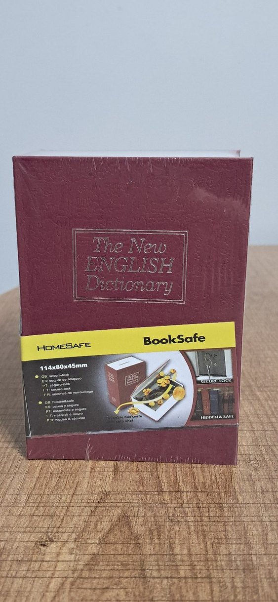 The New English Dictionary görünümlü, 114x80x45mm ölçülerinde gizli bölmeli güvenlik kasasıdır. Değerli eşyalar için kilitli saklama alanı sunar.
