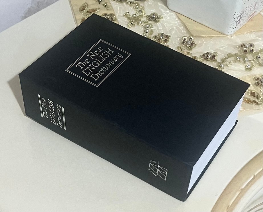 Çelik kasa The New English Dictionary, siyah sert kapak ve gümüş yazılarla İngilizce kelimeler için kapsamlı bir başvuru kitabıdır.
