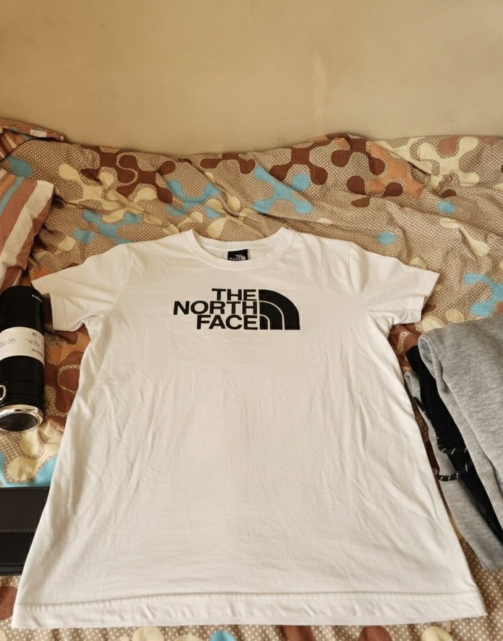 Beyaz, kısa kollu, bisiklet yaka ve baskılı The North Face logosu bulunan, günlük kullanıma uygun salaş kesim tişört.