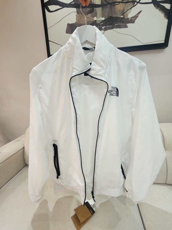The North Face markalı beyaz, parlak erkek yağmurluğu yüksek yakalı ve fermuarlı ceplidir. Yumuşak tüylü kumaştan, uzun kollu ve normal boyda, trend casual tarzda kesimlidir. ️ürünün kol kısmında yakından belli olan bi küçük bir hasar vardır resimde belirttim
