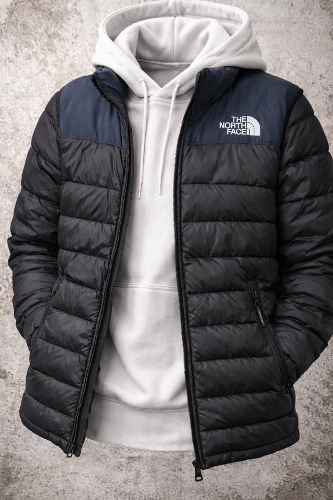 The North Face erkekler için gri, fermuarlı, yüksek yakalı, normal boyda, rahat kesim mont. Yumuşak ve sıcak kumaştan üretilmiştir.