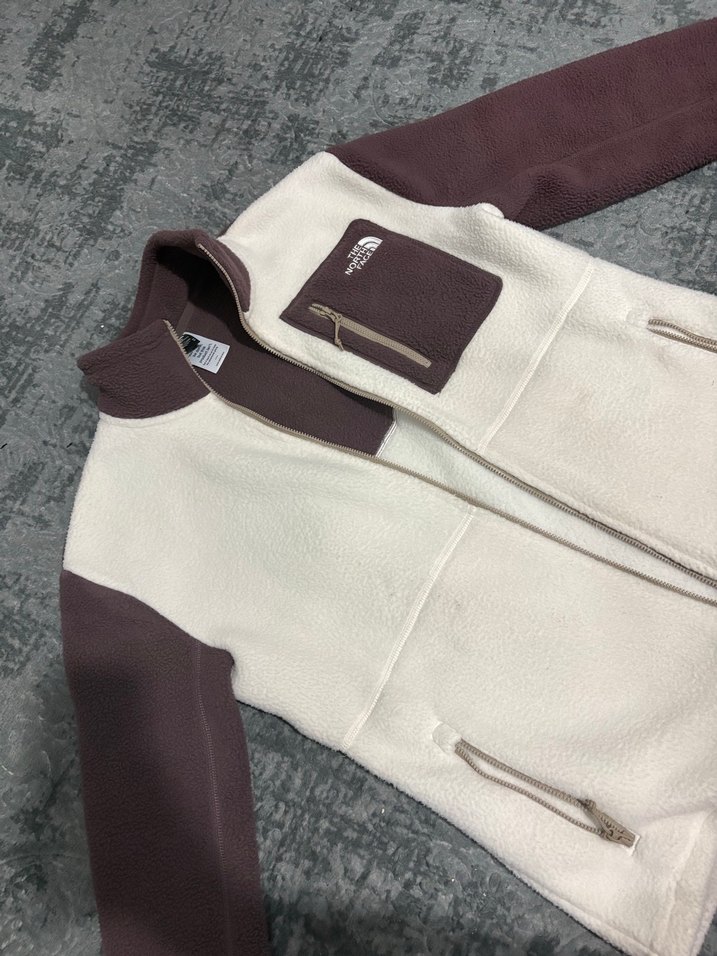 Fermuarlı cepler, yüksek yaka ve uzun kollu, mor ve krem renk kombinasyonlu, günlük kullanıma uygun, rahat kesim kadın polar ceket.