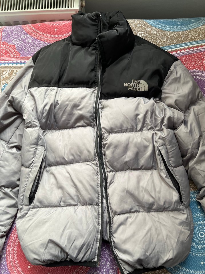 The North Face markalı, fermuarlı, yüksek yakalı, gri renkli, uzun kollu, midi boy erkek mont. Yumuşak ve sıcak kumaştan, rahat sokak stili için uygundur. Kolunda gözle görülemeyecek küçüklükte delik vardır