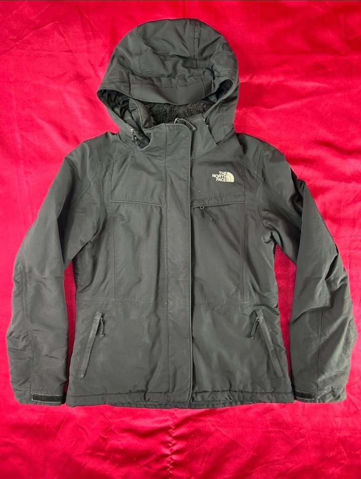 The North Face markalı, kapüşonlu, yüksek yakalı, fermuarlı ve uzun kollu gri kadın mont. Yumuşak ve sıcak kumaştan, dış mekan kullanımı için uygun.