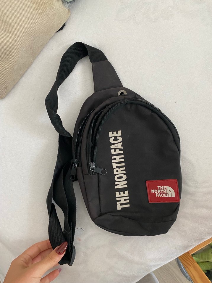 The North Face baskılı siyah omuz çantası, tokalı kayış ve kompakt tasarımla rahat athleisure tarzına uygun.