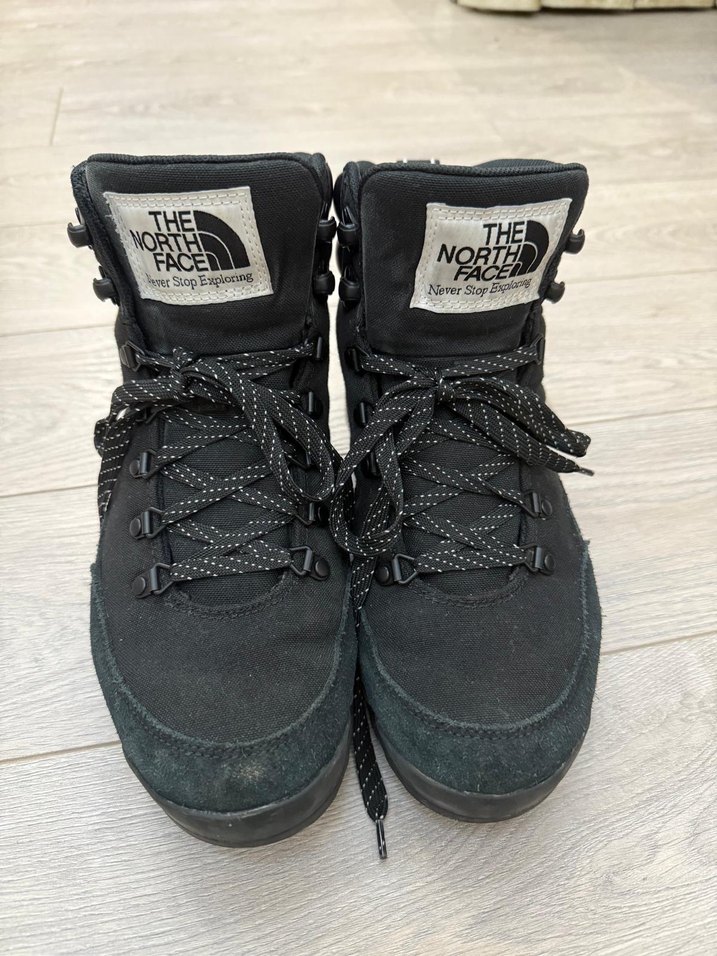 The North Face markalı, cırt cırt ve bağcıklı siyah erkek botları. Koyu renkte, desensiz, normcore athleisure tarzında. Üzerinde 'VORT' yazısı var.