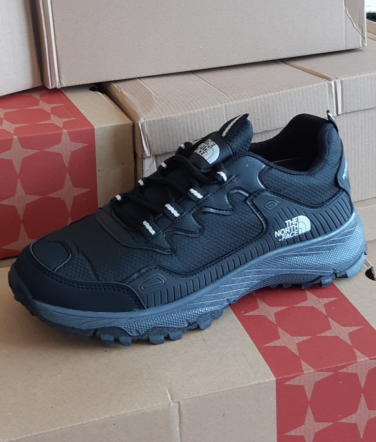 The North Face markalı, siyah renkli, bağcıklı erkek spor ayakkabısı, dayanıklı kauçuk tabanlıdır. su geçirmez paraşut kumaş yanları dikişli