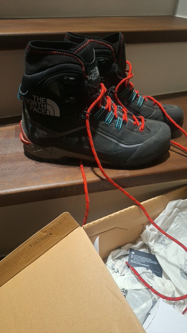 The North Face siyah botlar, kırmızı ve mavi detaylarla dayanıklı tabanlıdır. Atletik ve karşı kültür tarzında tasarlanmıştır.