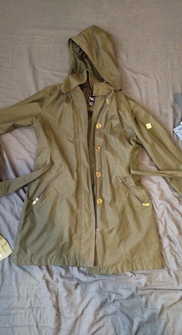 Belden kuşaklı, çıkabilen kapüşonlu haki yeşil yağmurluk