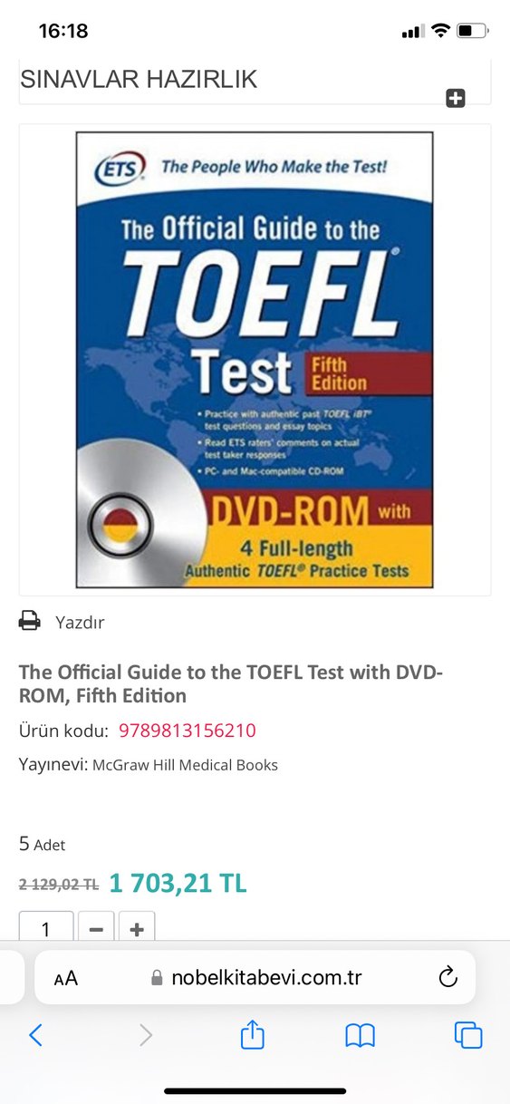 The Official Guide to the TOEFL Test 5. Baskı, DVD-ROM ile birlikte 4 tam uzunlukta gerçek TOEFL deneme testi içerir. Yayıncı: McGraw Hill Medical Books. Kitabın çok az kısmı çözülmüş o yüzden fiyatını uygun tuttum