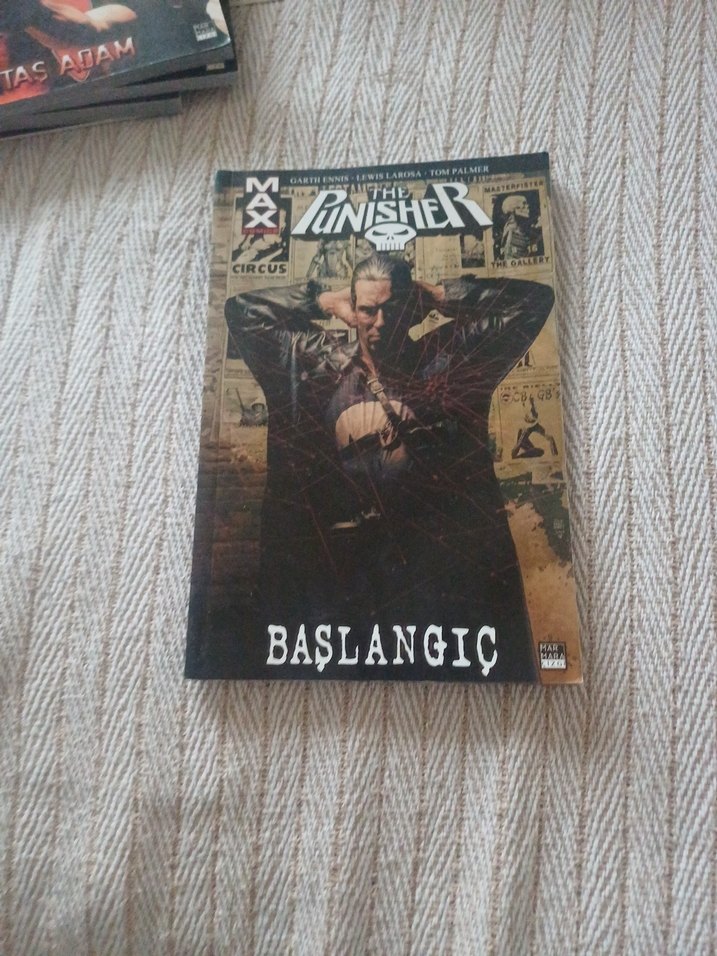 The Punisher çizgi romanı "Başlangıç" adlı kapak resmiyle, deri ceketli karakteri gösteriyor. THE PUNISHER MAX CİLT 1 - BAŞLANGIÇ ENNIS - LAROSA - PALMER - WHITE 2013 yili 1,baski temiz durumdadir