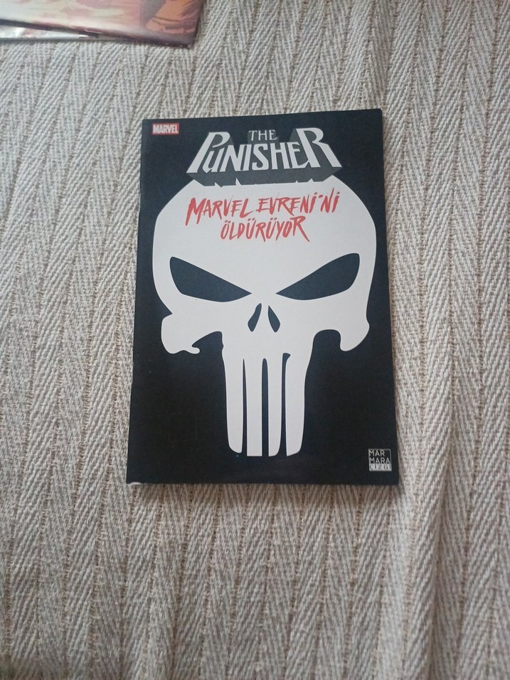 The Punisher çizgi romanı, kapağında ikonik kurukafa logosu ve "Marvel Evrenini Öldürüyor" başlığı ile Marvel tarafından yayımlanmıştır.The Punisher - Marvel Evreni'ni Öldürüyor GARTH ENNIS fasikul 2016 yili 1,baski