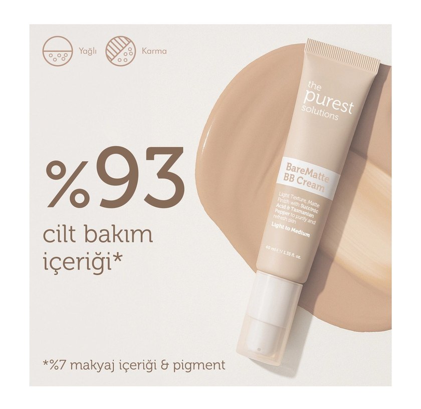 The Purest BareMatte BB Krem, yağlı ve karma ciltler için uygundur. %93 bakım içeriği ve makyaj pigmentleri ile hafif-orta kapatıcılık sağlar.