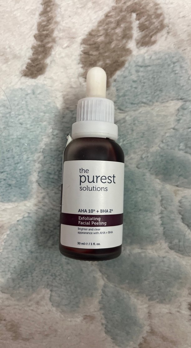 The Purest Solutions serumu, AHA %10 ve BHA %2 içeriğiyle cildi soyup aydınlatmak için 30 ml damlalıklı şişede sunulur. Yarısından fazlası dolu