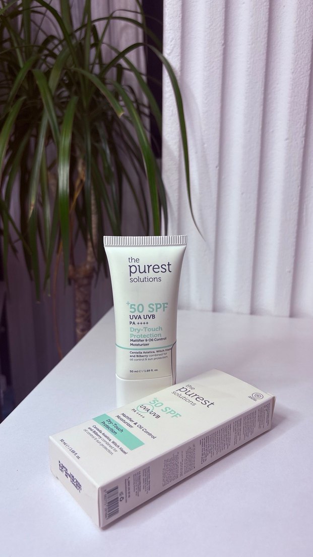 The Purest Solutions güneş kremi, UVA ve UVB ışınlarına karşı 50 SPF koruma sağlar. Yağlı, akneli cilt tipleri için uygundur ve mat bitişlidir.