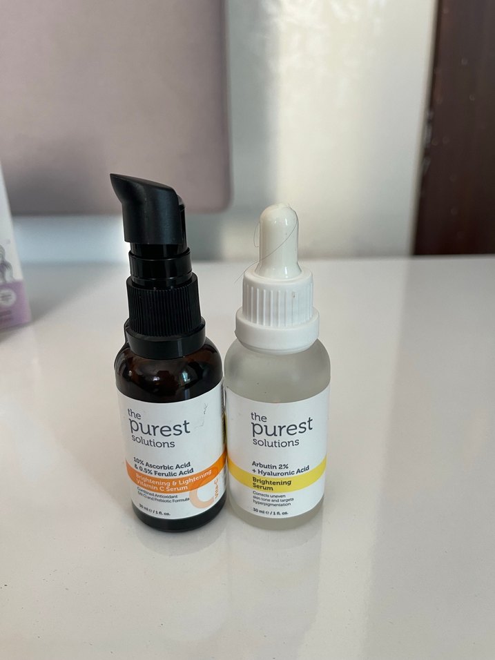 The Purest Solutions'dan 15% Askorbik Asit içeren aydınlatıcı ve yaşlanma karşıtı serum ile 2% Arbutin içeren cilt aydınlatıcı serum seti. Pompalı ve damlalıklı şişelerde. İkisi de yarıya kadar dolu ikili fiyat