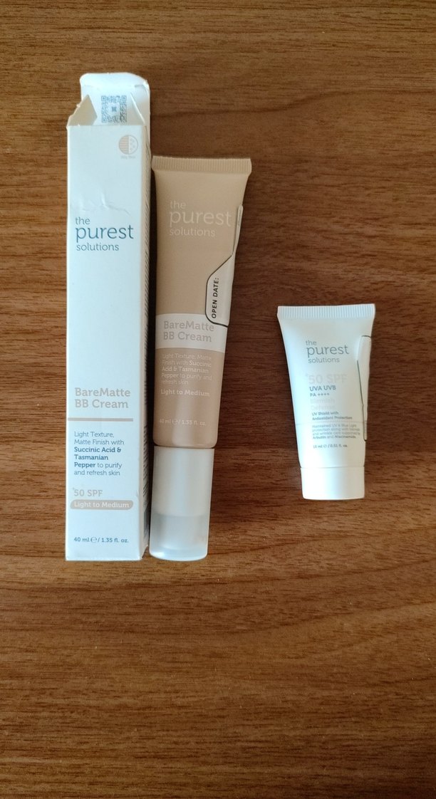 The Purest Solutions BareMatte BB Krem, açık buğday tene uygun, saten bitişli bir ürün, blemish defense bir tık daha koyu renkli ve 15 ml, ürünleri totalde 4 kere kullandım, ambalajlar bir tık boş gibi dursa da değil, ağustos 2025'de açtım. İkisinin birlikte fiyatıdır.