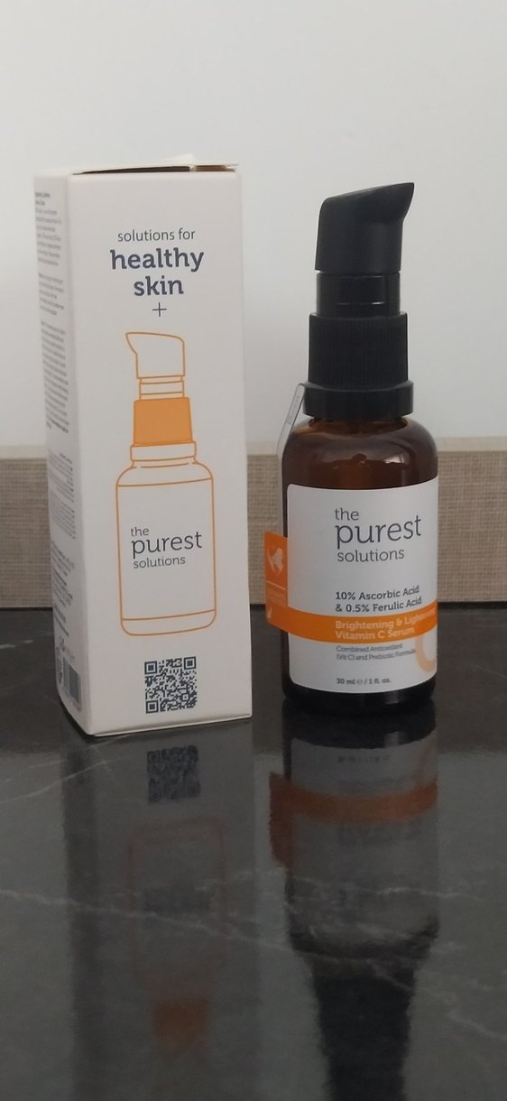 The Purest Solutions serumu, %10 Askorbik Asit ve %0,5 Ferulik Asit içerir, cildi aydınlatır ve sağlıklı görünüm sağlar. yeni etiketli üründür. resim çekmek için kutusundan çıkardım sadece