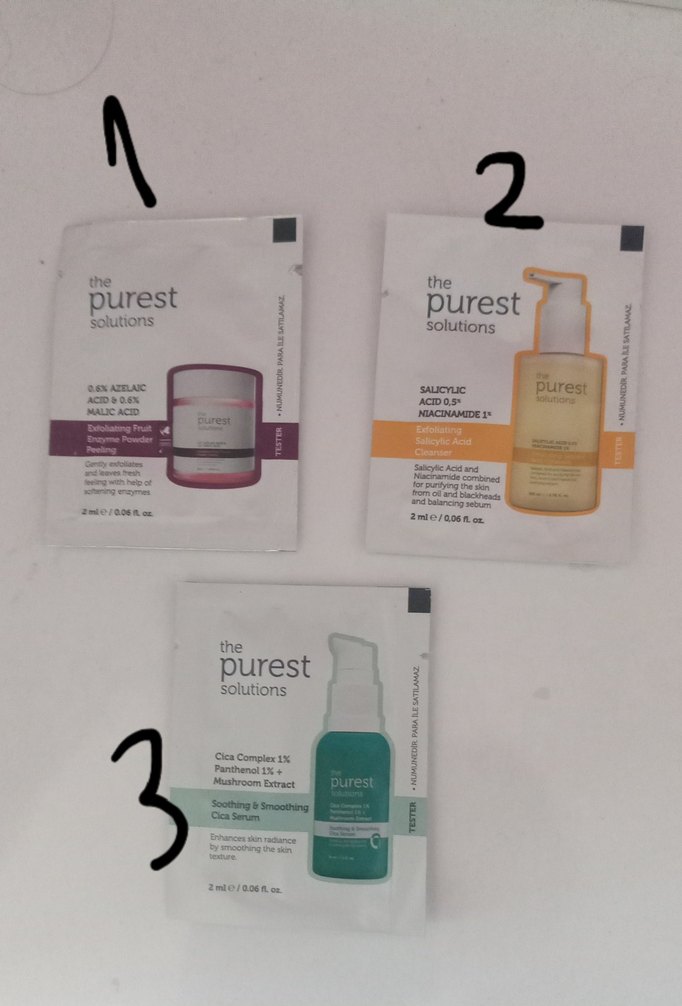 The Purest Solutions üçlü cilt bakım örnekleri; Azelaik Asit & Çinko, Salisilik Asit & Niasinamid ve Cica Kompleksi ile yatıştırıcı ve pürüzsüzleştirici çözümler sunar. Her biri 2 ml. Bir tester 20 tl dir.