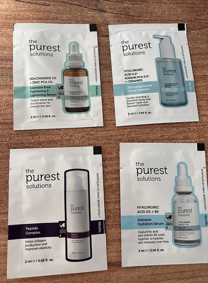 The Purest Solutions cilt bakım seti, hyaluronik asit ve peptid kompleksi içeren nemlendirici serumlar, niasinamid ve çinko içeren sıkılaştırıcı serum ile nazik nemlendirici temizleyici içerir. Cildi nemlendirir, gözenekleri sıkılaştırır ve elastikiyeti artırır.
