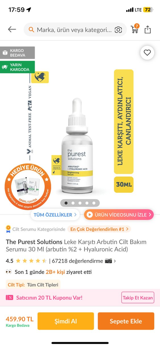 The Purest Solutions serumu %2 arbutin ve hyaluronik asit içerir, leke karşıtı, aydınlatıcı ve canlandırıcı etki sağlar. 30ML, hayvan testi yapmayan ve vegan formüldür.