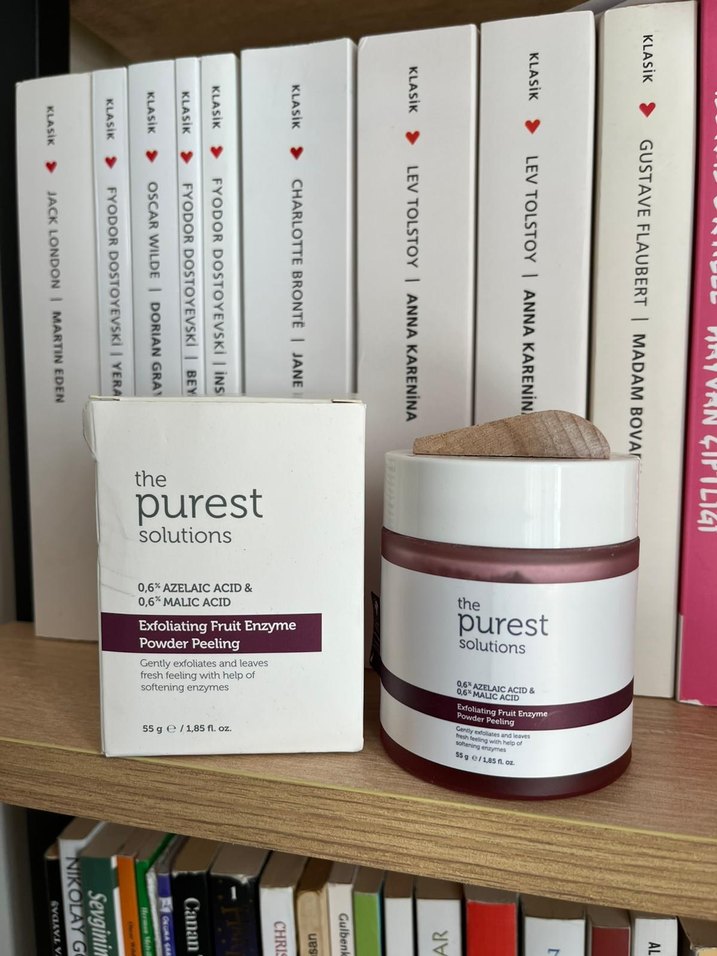 The Purest Solutions Meyve Enzimli Peeling Tozu, %0.6 azelaik ve %0.6 malik asit içerir. Cildi nazikçe eksfoliye eder, ölü hücreleri temizler ve cildi yatıştırır. görüldüğü gibi