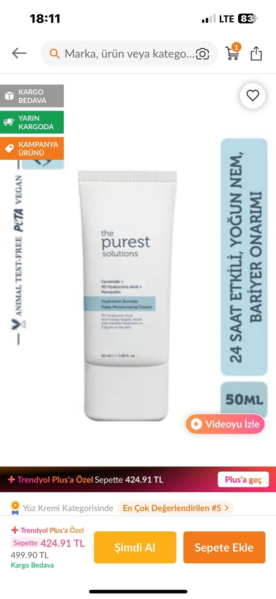 The Purest Solutions Hydration Booster krem, cildi derinlemesine nemlendirir ve besler. Seramid, hyaluronik asit ve panthenol içerir.