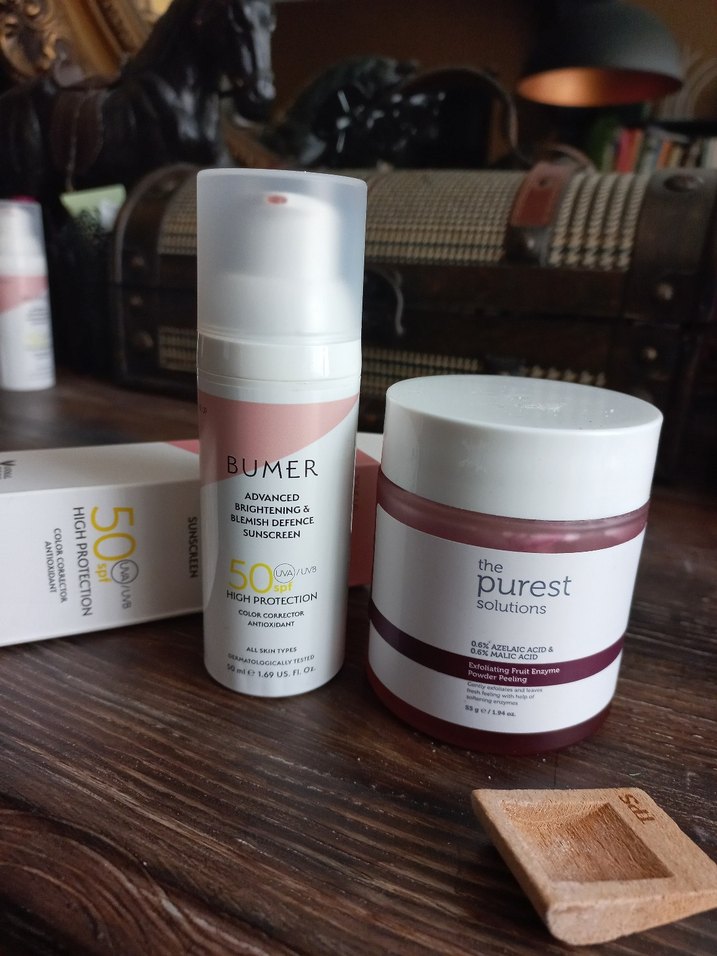 The Purest Solutions meyve enzimli peeling tozu, %0.6 azelaik asit ve %0.6 malik asit içerir. Cildi nazikçe eksfoliye eder ve yatıştırıcı enzimlerle ferahlatır. 55g. Yüzde 85 doludur çok güzel ürün ama o kadar fazla ürünüm var ki boğuldum resmen azalmaya çalışıyorum. Bumer 50 faktor güneş kremi koruyucu renkli..Bu urun sıfırdır ben sadece kutuyu acarken üst kapağı yırttım yanlışlıkla..Kendi sitesinde fiyatı şu an 900 lira..