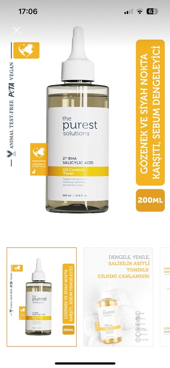 The Purest Solutions 2% BHA Salisilik Asit tonik, gözenekleri temizler, cildi canlandırır ve sebum dengesini sağlar. 200ml hacmindedir. Benim yüzüme iyi gelmedi sadece iki gün kullandım şişenin neredeyse hepsi dolu