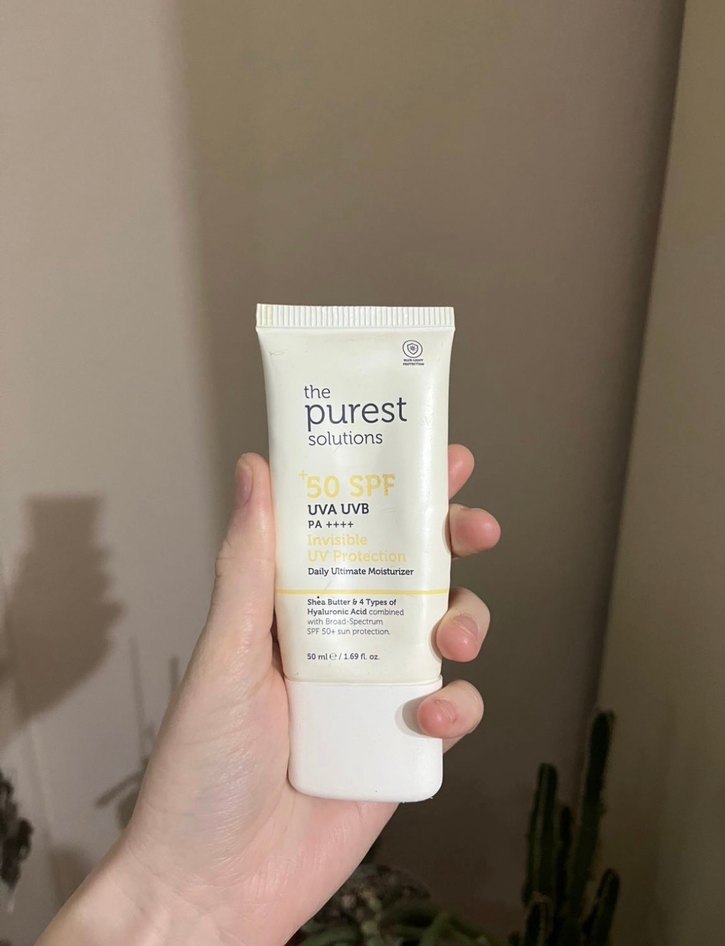 The Purest Solutions güneş koruyucu, SPF 50 ile UVA ve UVB ışınlarına karşı koruma sağlar. Shea yağı ve hyaluronik asit içerir, cildi nemlendirir ve bakım yapar. ☀️
