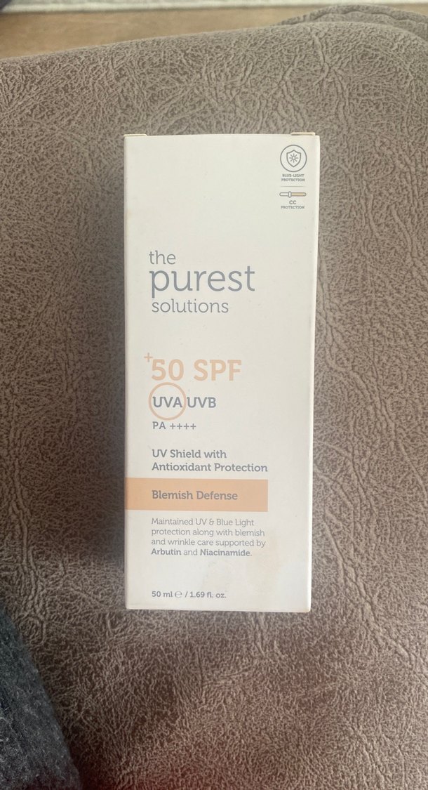 The Purest Solutions, SPF 50 ve PA++++ derecesiyle UVA ve UVB ışınlarına karşı koruma sağlar. Antioksidan koruma ve lekeye karşı savunma içerir. Arbutin ve niasinamid ile UV ve mavi ışık koruması sunar.