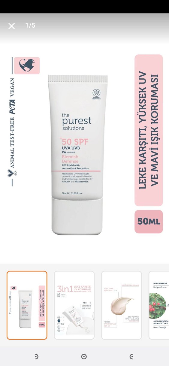 The Purest Solutions SPF 50 güneş koruyucu krem, yüksek UVA ve UVB koruması sağlar. Leke karşıtı, mavi ışık korumalı ve antioksidan içerir. 50 ml, vegan ve hayvan testi yok. ☀️orjinaldir 2.3 kez kullanıldı ama çok beyaz tenliyim 07.2026 ya kadar kullanımı mevcuttur üzerinde yazıyır