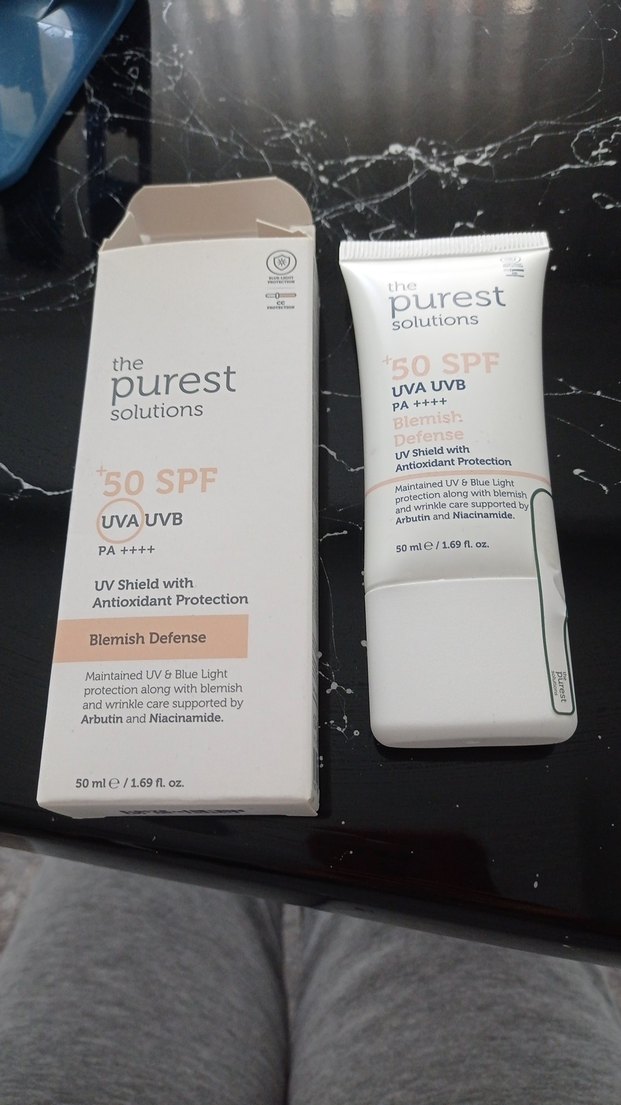 The Purest Solutions SPF 50 güneş koruyucu krem, UVA ve UVB koruması sağlar. Arbutin ve niasinamid içeren, leke ve mavi ışık koruması sunar. 50ml tüp içinde. hiç kullanılmadı etiketlidir yüzde ağırlık yapmaz cilt tonu eşitleyicidir