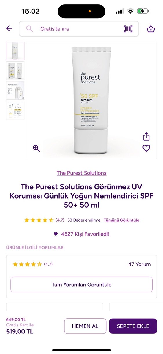 The Purest Solutions, görünmez UV koruması ve SPF 50+ ile günlük yoğun nemlendirme sağlar. Cildi UVA ve UVB ışınlarından korur. ☀️ %90 ı dolu ,çok az kullandım