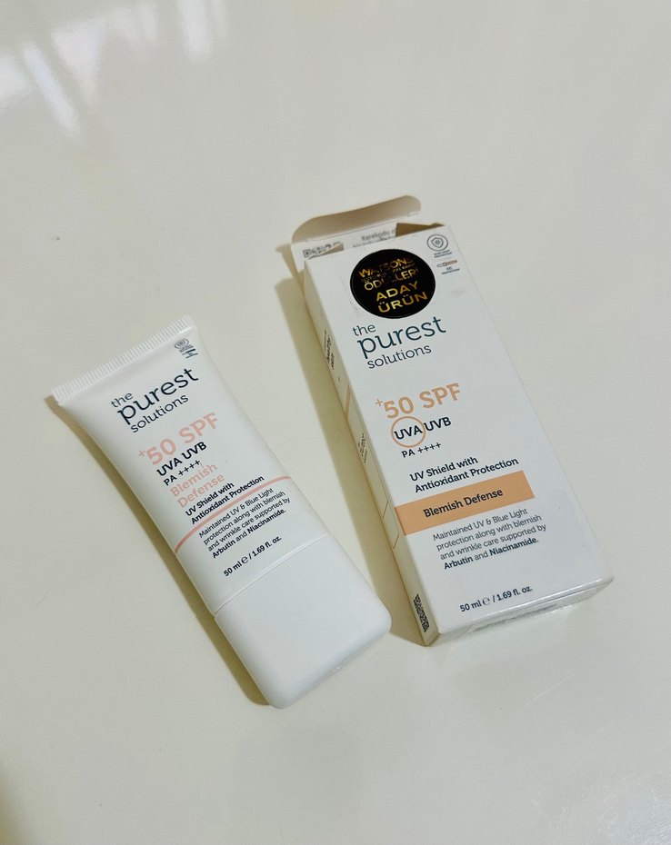 The Purest Solutions SPF 50 güneş koruyucu, UVA ve UVB ışınlarına karşı koruma sağlar. Online kendi satıcısından aldım. Renkli olduğunu açtıktan sonra fark ettim. O yüzden ful dolu. Bir kere denendi ancak rengi bana uygun olmadığı için satışa koydum. Denemek isteyen ya da seveni varsa güvenle alabilir. Ürünün kendi açıklamasını da ekliyorum: Yüksek UV Koruması:SPF 50+ formülüyle UVA/UVB ve mavi ışığa karşı etkin koruma sağlayarak cildinizi güvenle savunur. Leke ve Ton Eşitleme:Arbutin ve niacinamide içeren özel yapısıyla ciltteki leke görünümünü azaltmayı ve ton farklılıklarını eşitlemeyi destekler. Hassas Cilt Uyumu:Müşteri geri bildirimlerine göre hassas cilt tipleri için uygun bir yapıya sahiptir, geniş bir kullanıcı kitlesine hitap eder.