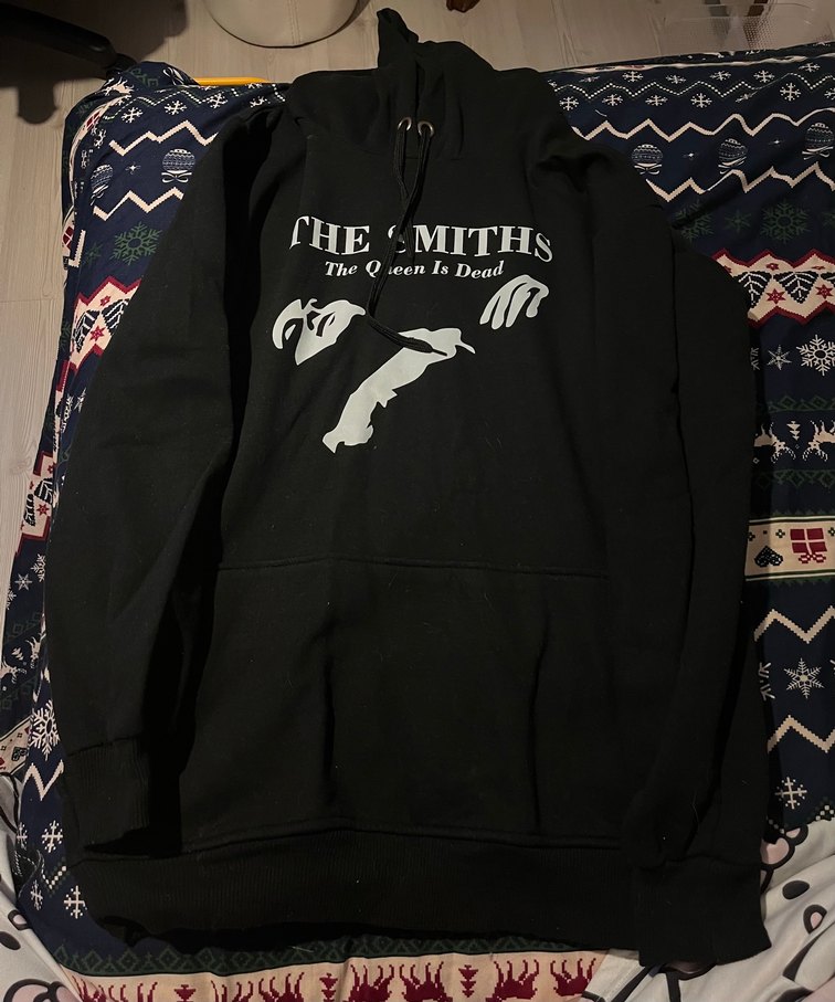 Siyah renkli, uzun kollu, kapüşonlu bu sweatshirt, 'THE SMITHS The Queen Is Dead' baskısına sahip. Normal uzunlukta ve yumuşak kumaştan üretilmiştir.