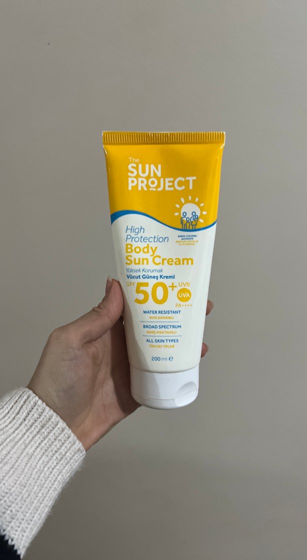 The Sun Project markalı, SPF 50+ koruma faktörlü, tüm cilt tiplerine uygun, suya dayanıklı vücut güneş kremi. 200 ml'lik ambalajda sunulur. ☀️aile boyu çok büyük çok az kullanıldı