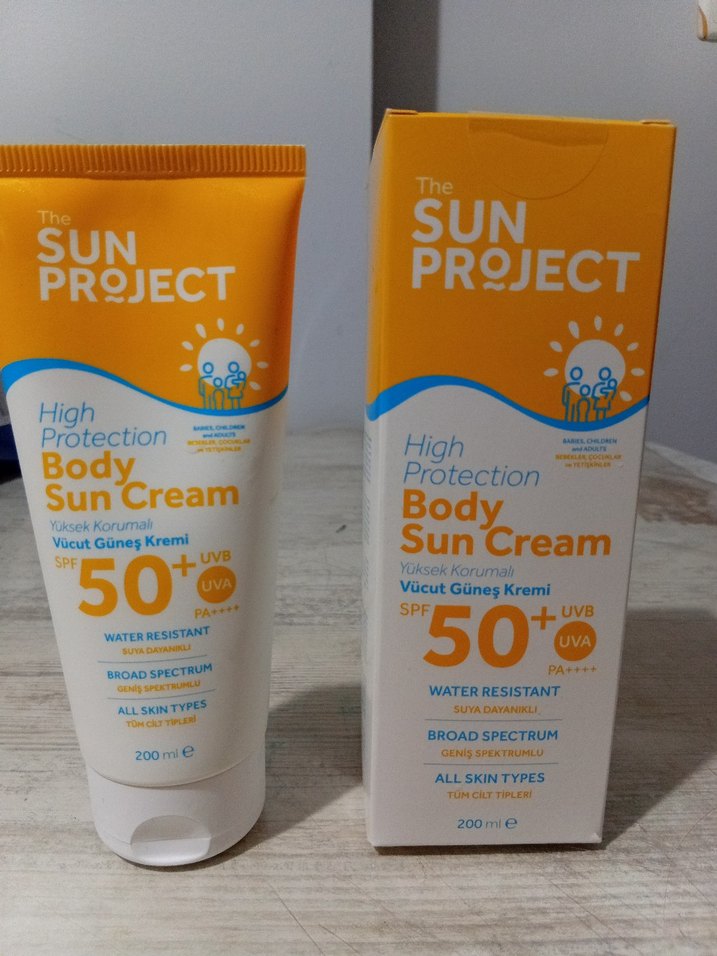 The Sun Project vücut güneş kremi, SPF 50+ yüksek koruma, geniş spektrum ve suya dayanıklılık sağlar. Tüm cilt tipleri için uygundur, 200 ml boyutundadır. ☀️