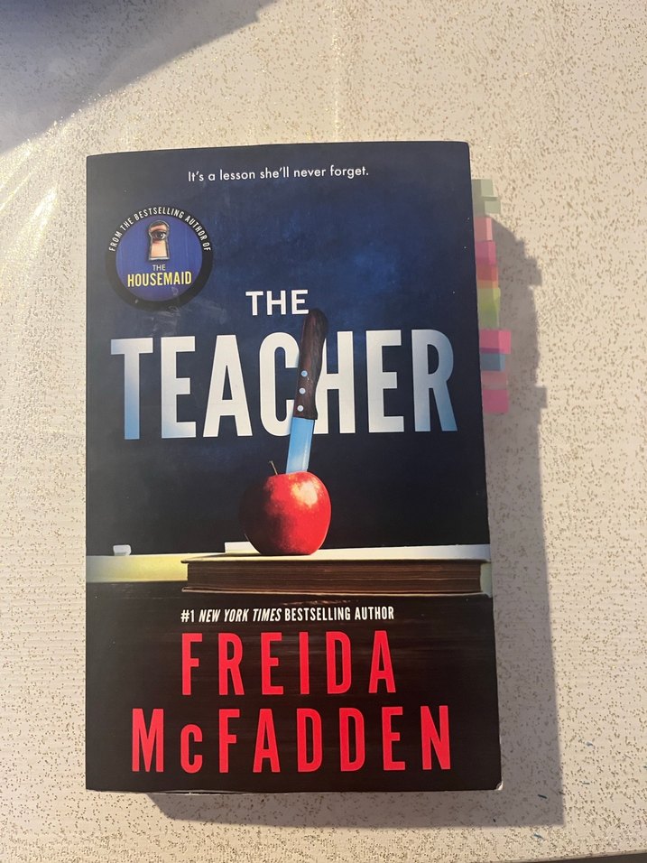 Freida McFadden'in The Teacher adlı romanı, masadaki elmaya saplanmış bıçakla simgelenen karanlık bir hikaye anlatıyor. Kitap dili ingilizcedir . Bazı sayfaları çizilmiştir . Ama kitap yepyeni durumdadır .