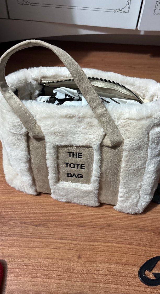 Peluş detaylı, beyaz renkli ve baskılı kadın el çantası. 'THE TOTE BAG' etiketi bulunur. Yumuşak dokulu, rahat ve şık günlük çanta.