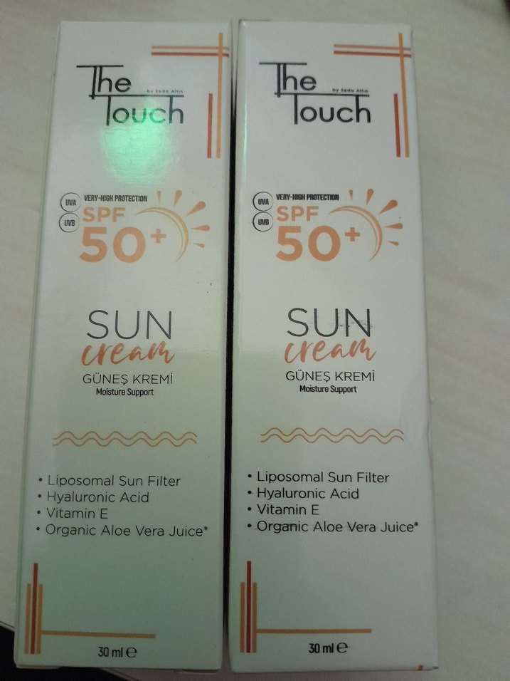 The Touch SPF 50+ güneş kremi, liposomal güneş filtresi, hyaluronik asit, vitamin E ve organik aloe vera suyu ile nem desteği sağlar. Açılmamış 2 paket fiyatıdır.