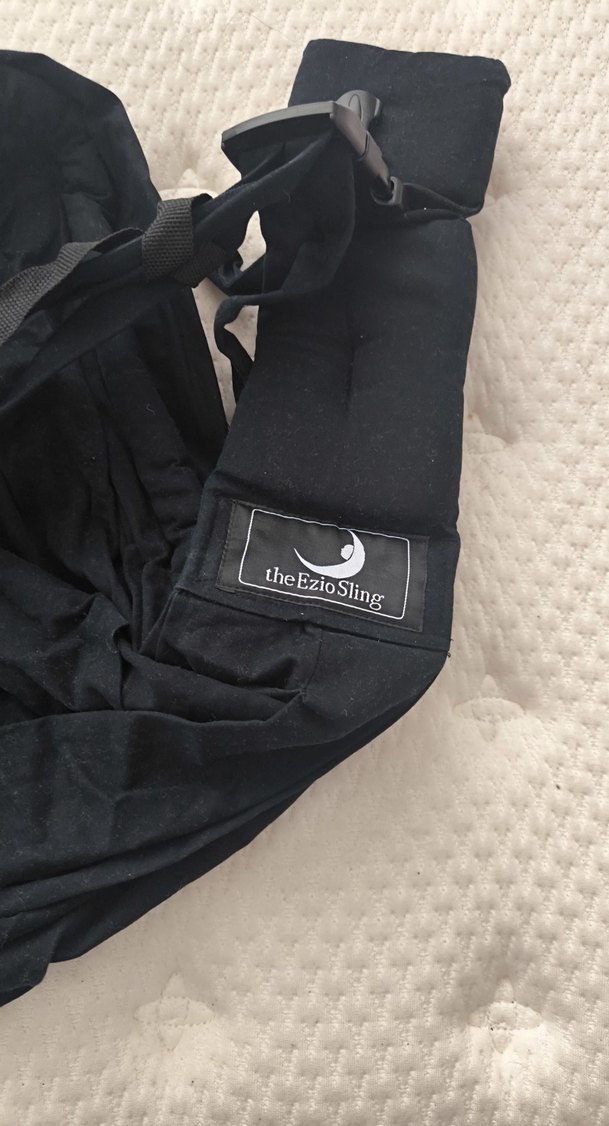 theEzioSling siyah bebek taşıyıcı, ayarlanabilir kayışlar ve yumuşak kumaş ile rahat ve güvenli taşıma sağlar.