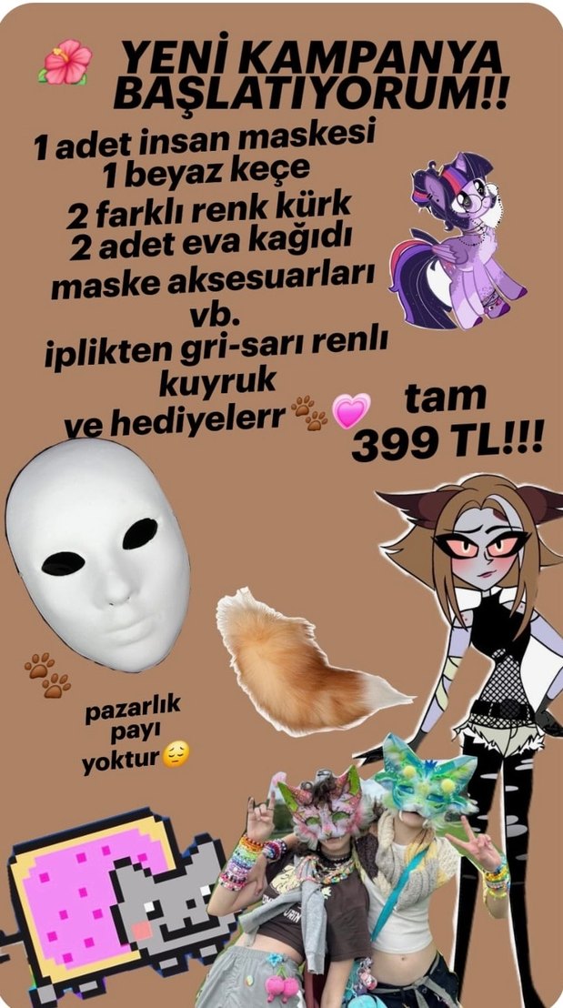 1 adet insan maskesi, 1 beyaz keçe, 2 farklı renk kürk, 2 adet eva kağıdı ve maske aksesuarları içerir. İplikten gri-sarı renkli kuyruk dahil pazarlık yok.