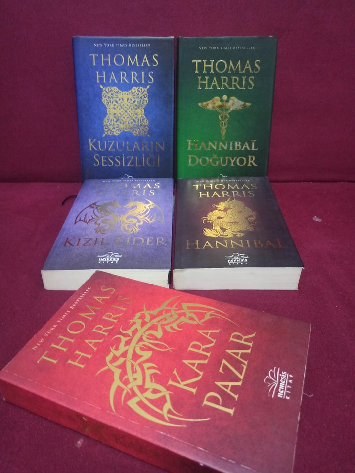 Thomas Harris'in "Kuzuların Sessizliği" ve "Hannibal Doğuyor" gibi kitaplarının yer aldığı 5 romanlık set. Kitaplar renkli kapaklıdır.